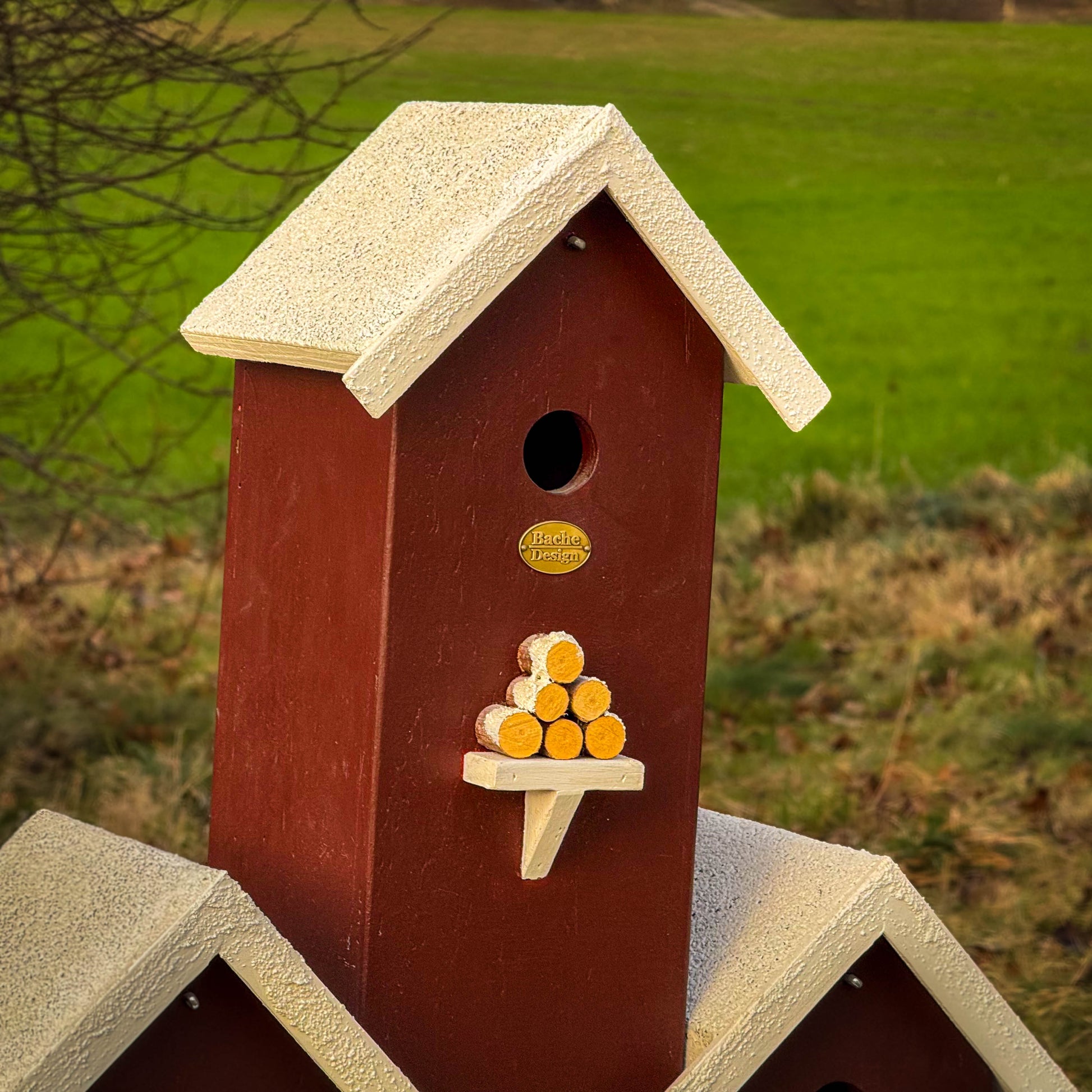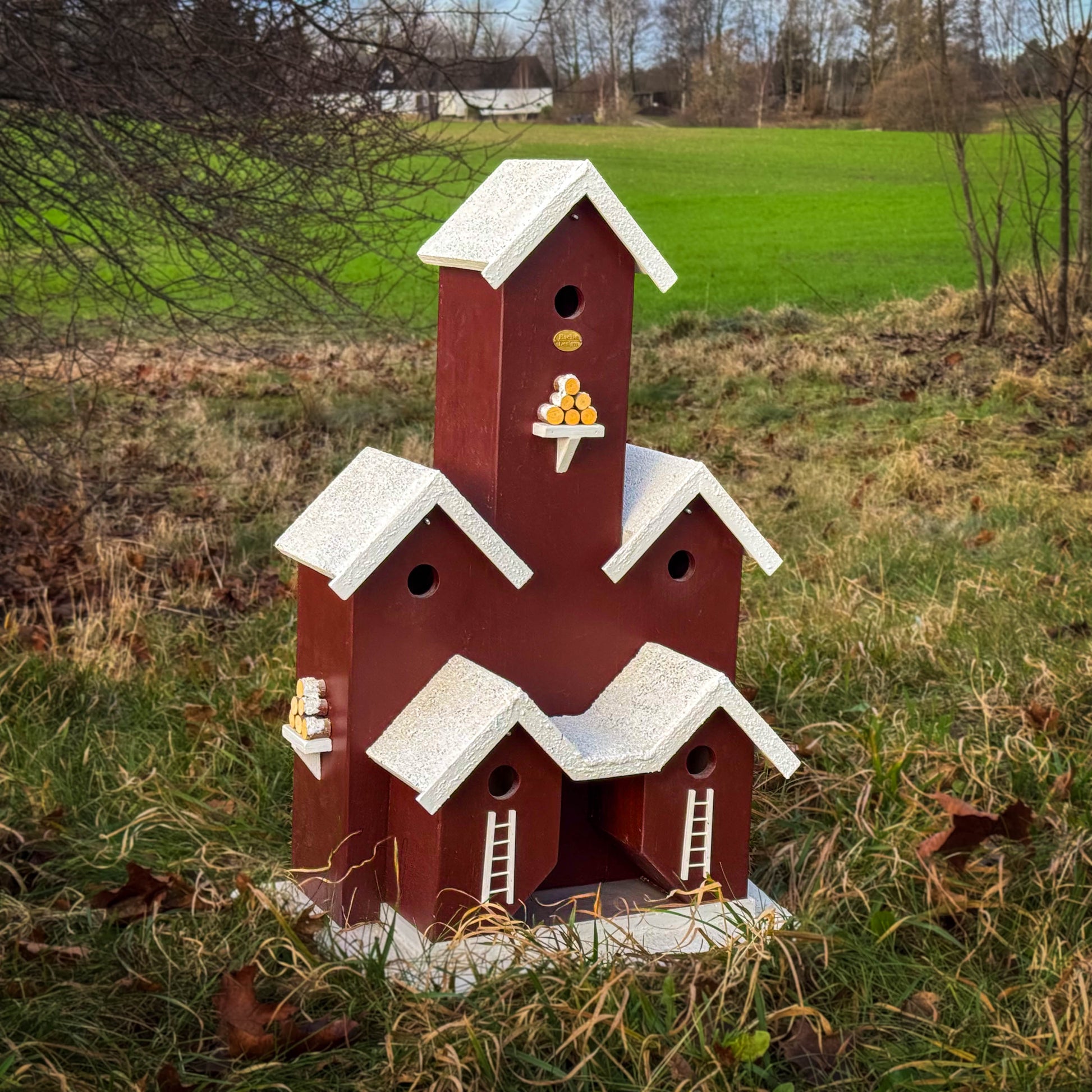 Giv havens spurve en ekstra portion julehygge med vores festlige "Julehotel," en charmerende kombination af funktionel spurvehotel og hyggelig juledekoration. Med sine varme røde farver, snedækkede tag-effekt og håndmalede juledetaljer bringer dette fuglehus den magiske julestemning direkte ind i din vinterhave.