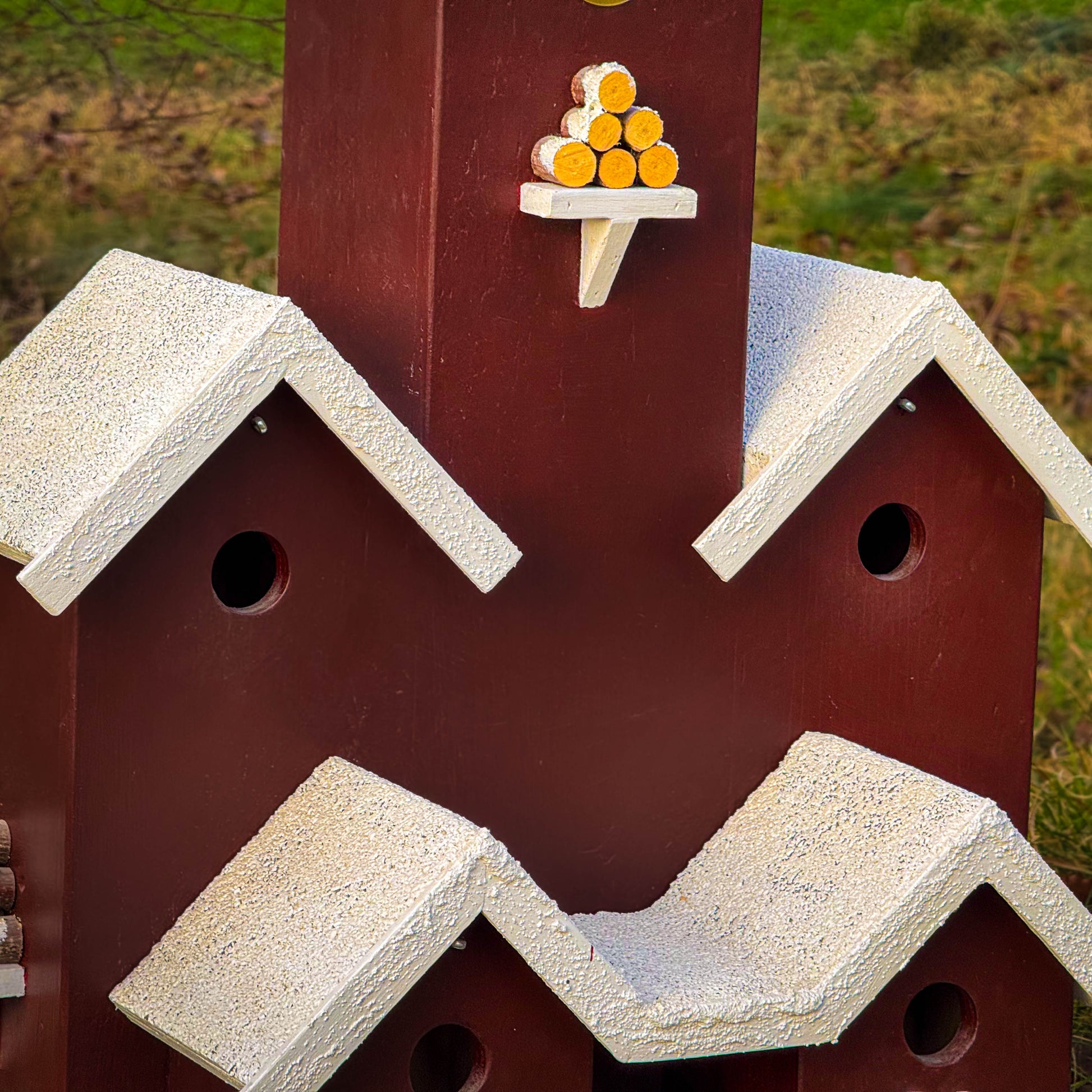 "Julehotel" er håndlavet med samme omhu og høje kvalitetsstandarder som alle vores fuglehuse. Fremstillet af kraftige FSC-godkendte materialer og behandlet med træbeskyttelse af høj kvalitet, sikrer vi maksimal tæthed mod fugt og lang levetid. Det svejsede tagpap garanterer optimal beskyttelse mod vinterens vejrlig.