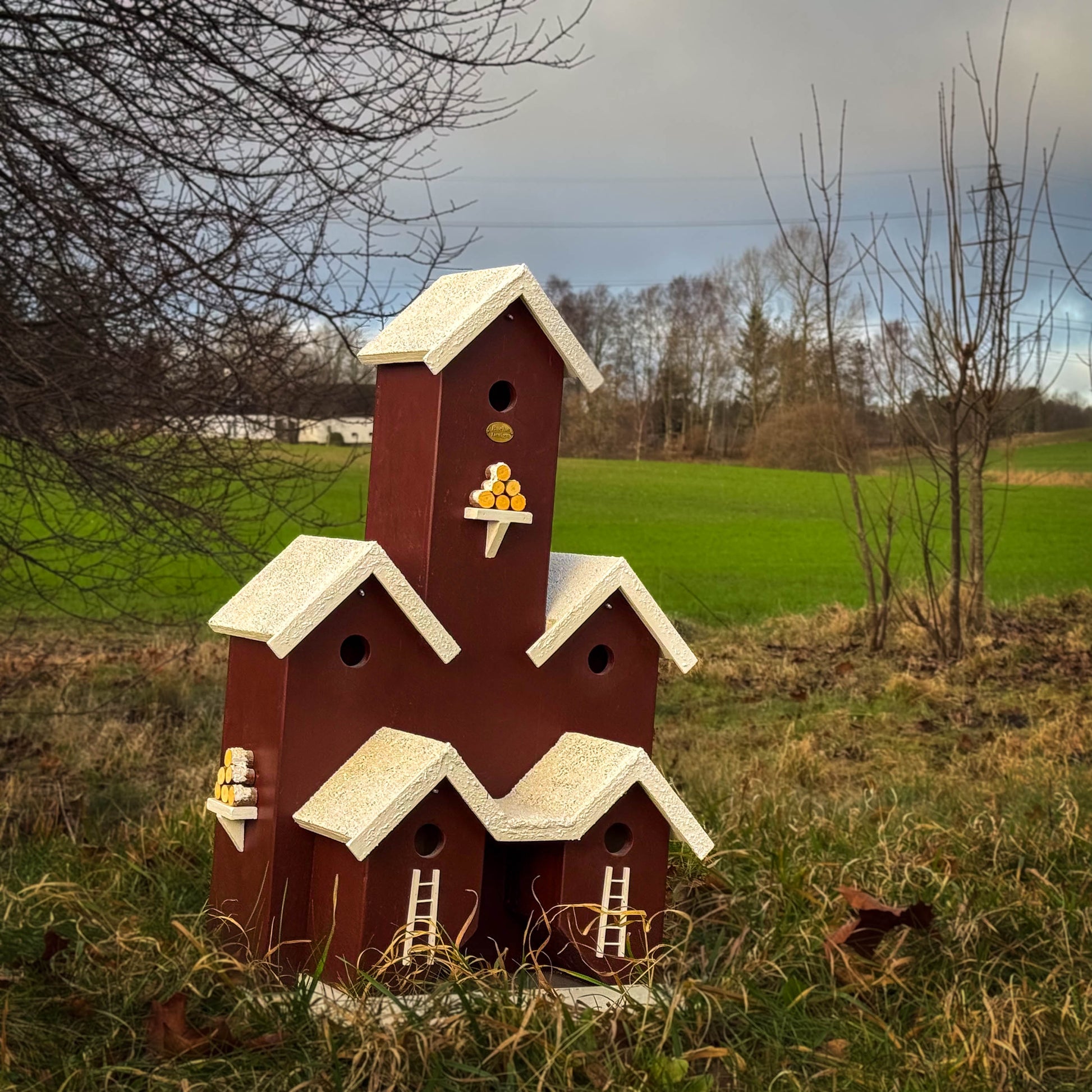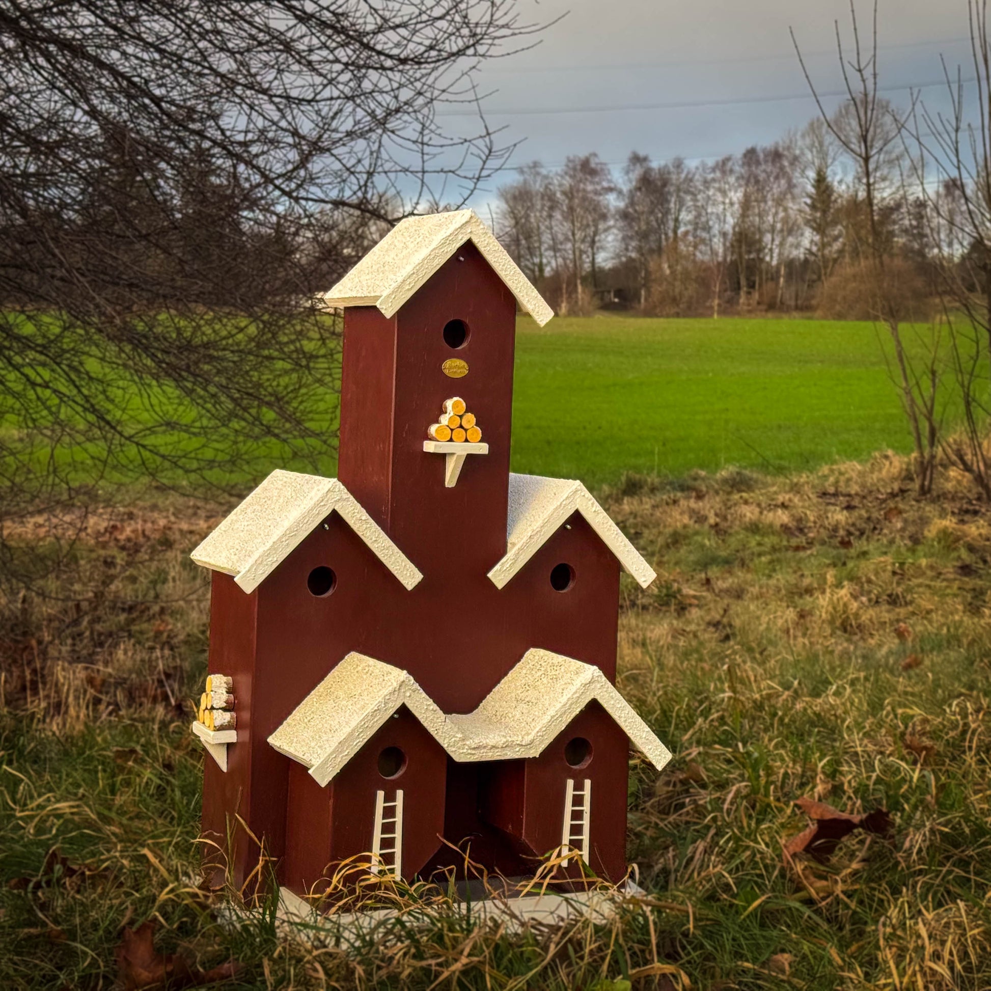 De forskellige indgangshuller giver plads til flere spurvefamilier, lige præcis som de foretrækker, mens den robuste konstruktion sikrer beskyttelse mod vinterens kulde og vejr i mange år i fremtiden. De dekorative elementer - fra det hyggelige hvide "snedække" på taget til de festlige julepynt - skaber et smukt syn gennem hele året, ikke kun i vinteren.